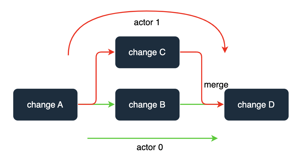 As the number of operations increases, maintaining the Hash DAG can become cumbersome. In Automerge, we take a different approach by using change. A change is a combination of operations, as you have seen before:
