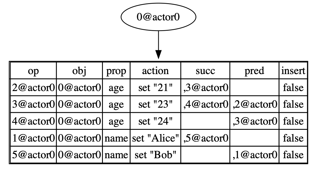 Therefore, to compress operations during the encoding of changes, we utilize columnar encoding. To give you an intuitive impression, we provide an example: